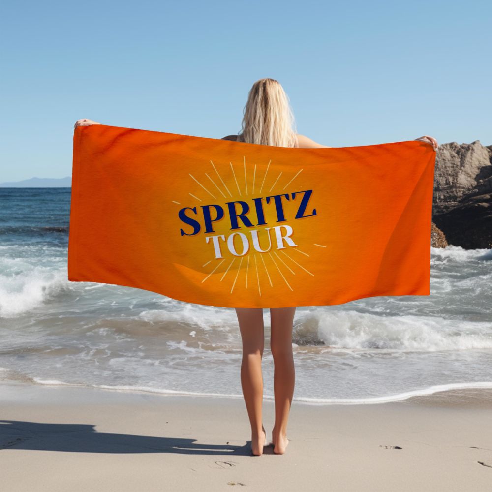 Entdecke unser einzigartiges Handtuch im vertrauten und unverwechselbaren spritzigen Design! Perfekt für alle, die den Sommer lieben und den bittersüßen Drink besonders gerne schlürfen. Mit zwei personalisierbaren Zeilen kannst du deiner Kreativität freien Lauf lassen, etwa "Spritz Tour", "Holy Aperoly" oder doch etwas ganz Eigenes. Die fröhlichen Farben und das ikonische Design kombiniert mit deinem eigenen Text machen es zum ultimativen Sommer-Accessoire (und definitiv zum Hingucker).